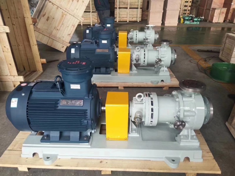 CQB(R)磁力泵通常由電動機;磁力偶合器和耐腐蝕離心泵組成。其主要特點是利用磁力偶合器傳遞動力:完全無泄漏,當電動機帶動磁力偶合器的外磁鋼旋轉時:磁力線穿過問隙和隔離套,作用於內磁鋼上使泵轉子與電動機同步旋轉,無機械接觸地傳遞扭矩。在泵軸的動力輸入端,由於液體被封閉在靜止的隔離套內,沒有動密封因而完全無泄漏。